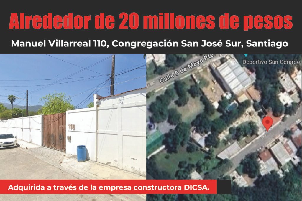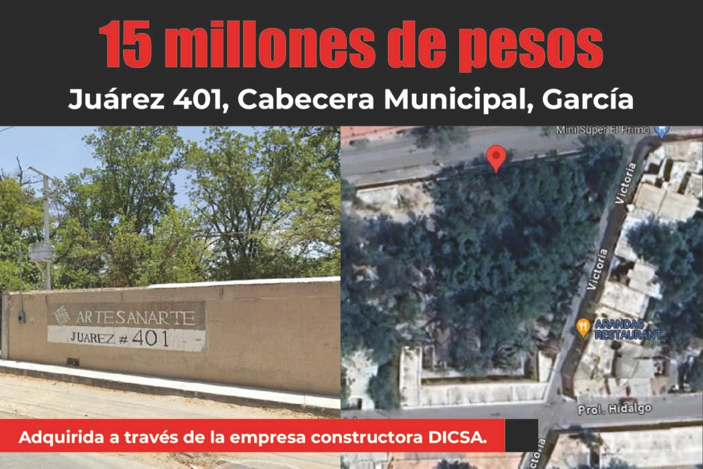 1. Juárez 401, cabecera municipal de García. Esta propiedad con un valor aproximado de 15 millones de pesos, fue adquirida a través de la empresa constructora DICSA. DICSA ha sido favorecida con contratos de obras públicas en el municipio de García, lo que sugiere un conflicto de intereses.