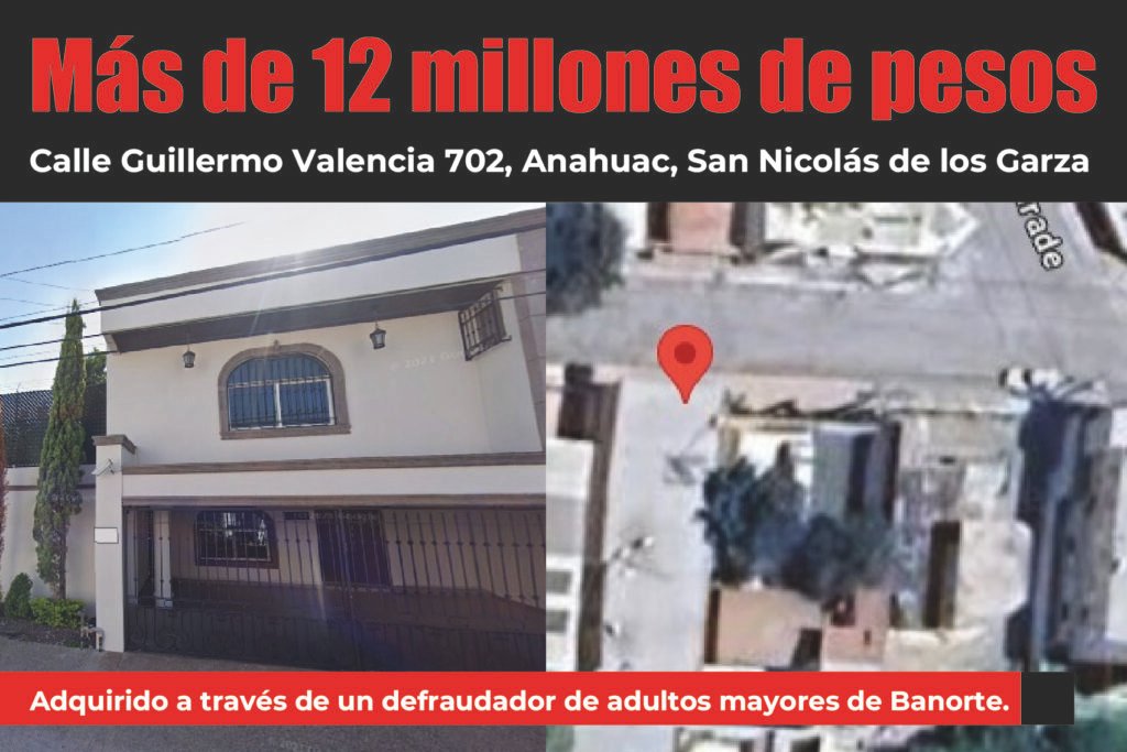 2.- Calle Guillermo Valencia 702, Anahuac, SanNicolás de los Garza. Este inmueble, valorado en más de 12 millones de pesos, fue adquirido a través de un defraudador de Banorte. La conexión con un caso de fraude bancario arroja serias dudas sobre la legalidad de esta adquisición.